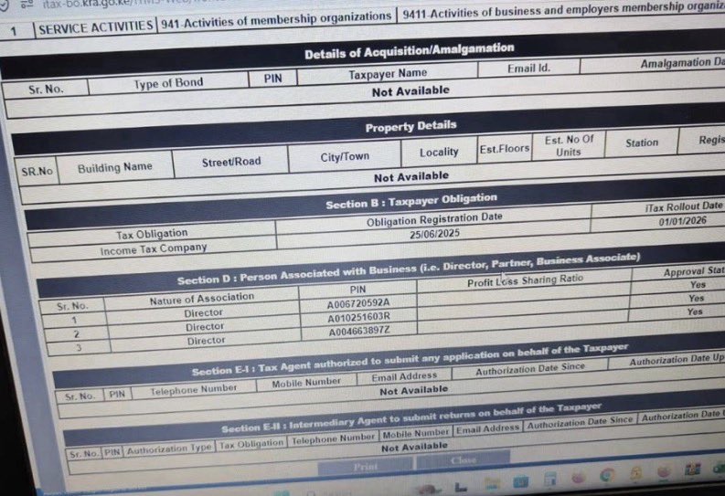 Riskwell Insurance Brokers Ltd was registered on 25 June 2025 with a nominal share capital of just Sh100,000 (Company No. PVT-A71VDDYY). Its three directors — Mohamud Yarrow Ibrahim (first listed, 300 shares), Abdullahi Mohamud Sheikh (majority 400 shares) and Nyairo Tom Nyairo (300 shares) — have no verifiable track record in the insurance industry, according to public registries, IRA databases and professional directories. The company’s registered office at “The Oval Office, Waiyaki Way, Westlands” does not exist at that location; physical verification found no trace of operations there. Riskwell filed no KRA returns, held no VAT obligations and recorded zero trading activity — classic indicators of a phantom broker.