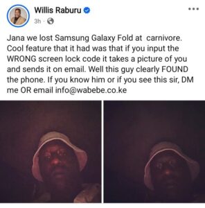 Raburu dropped the bombshell in a post that’s racking up shares faster than a matatu in rush hour: “Jana we lost Samsung Galaxy Fold at carnivore. Cool feature that it had was that if you input the WRONG screen lock code it takes a picture of you and sends it on email. Well this guy clearly FOUND the phone. If you know him or if you see this sir, DM me OR email [email protected].”